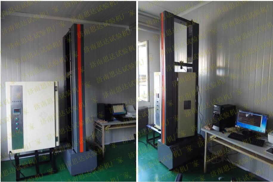 該設(shè)備為用戶定做設(shè)備,配置高溫箱,試驗溫度最高可達100℃,濟南思達定做的這款機型為加高型,高溫箱可自由滑動,并且配備專用的拉伸夾具,如下圖所示